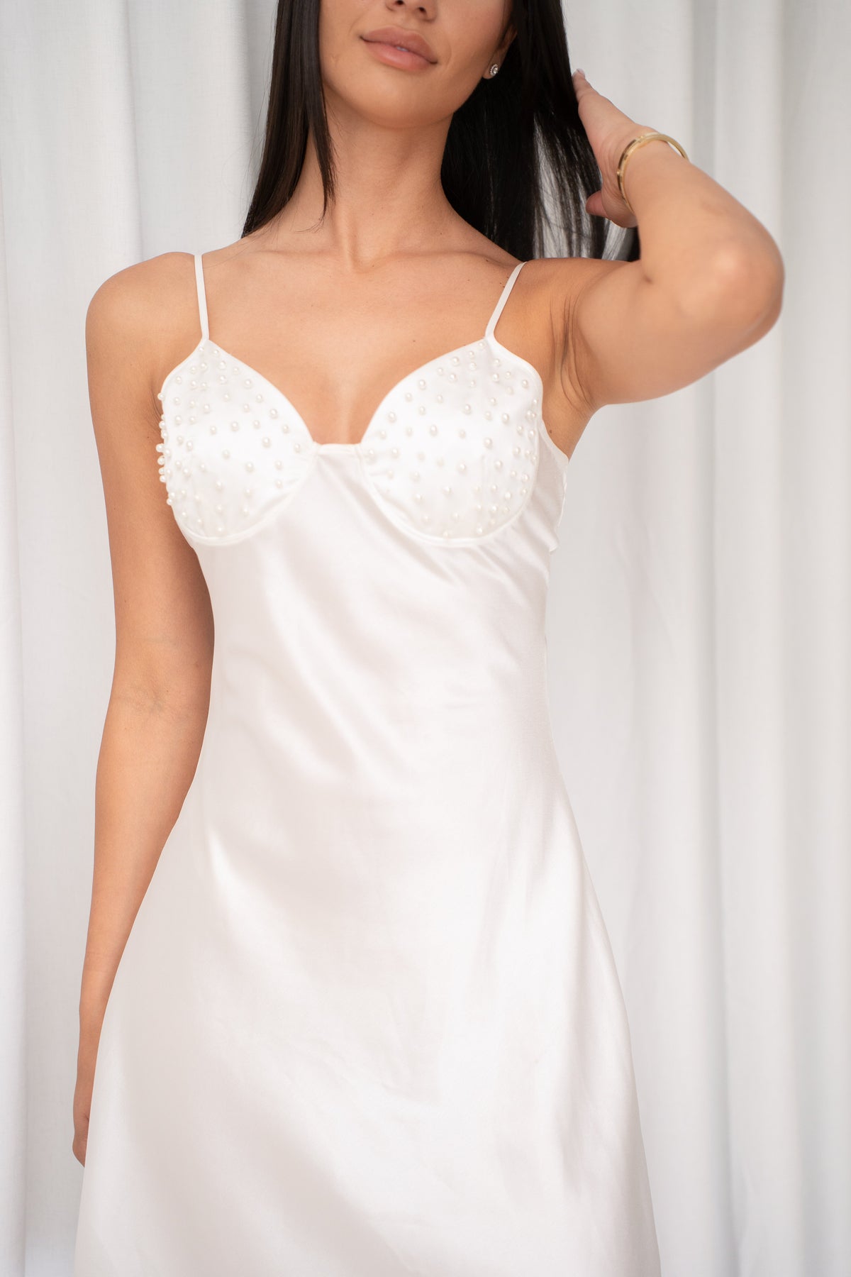 This gorgeous satin slip with hand sewn pearls is the perfect underdress for bridal robes or sleepwear.