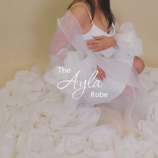 A vision of ethereal sophistication, the Ayla Bridal Robe embodies the art of timeless luxury. Crafted from delicate sheer organza, this couture-inspired piece features individually sculpted flowers, each meticulously handcrafted to create a cascading bloom effect that flows into an opulent, floor-sweeping train.